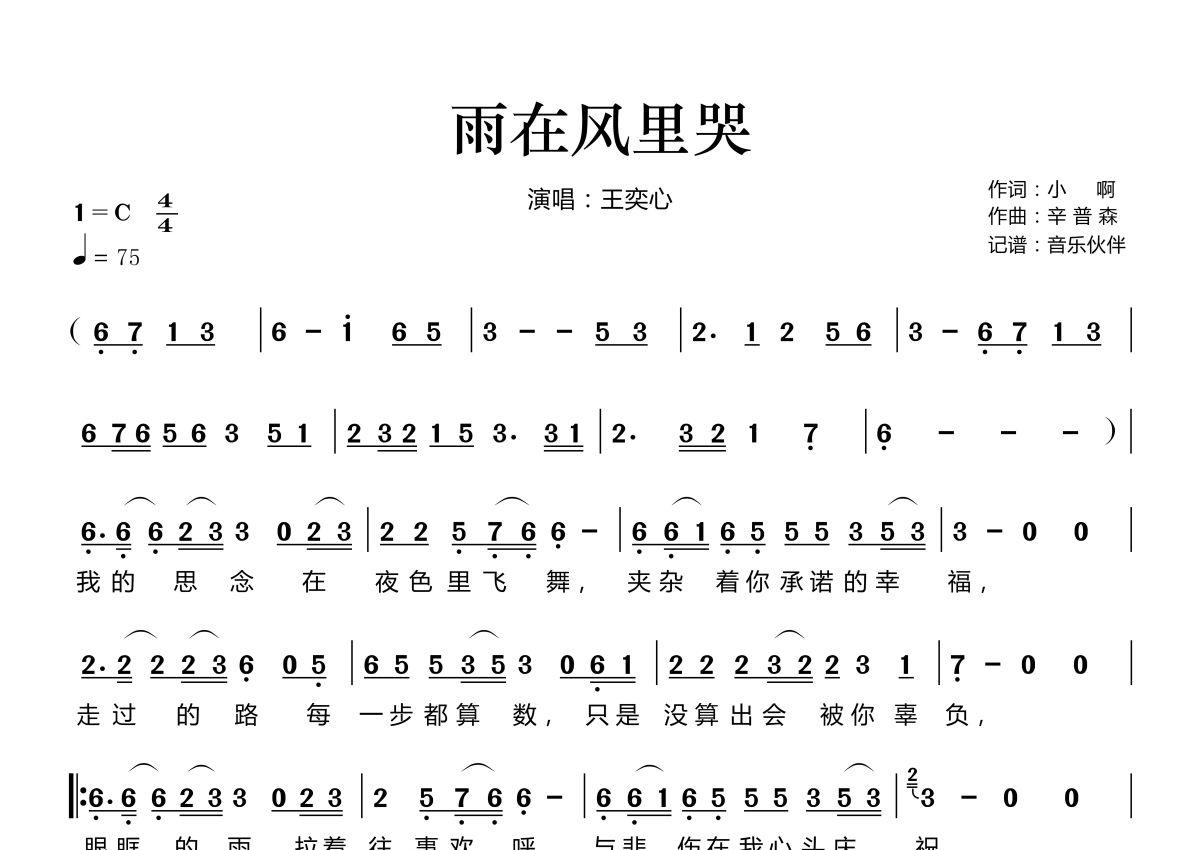 《雨在风里哭》是王奕心演唱的一首歌曲,这份简谱共有两张高清图谱,图谱由 @音乐伙伴 编配上传。