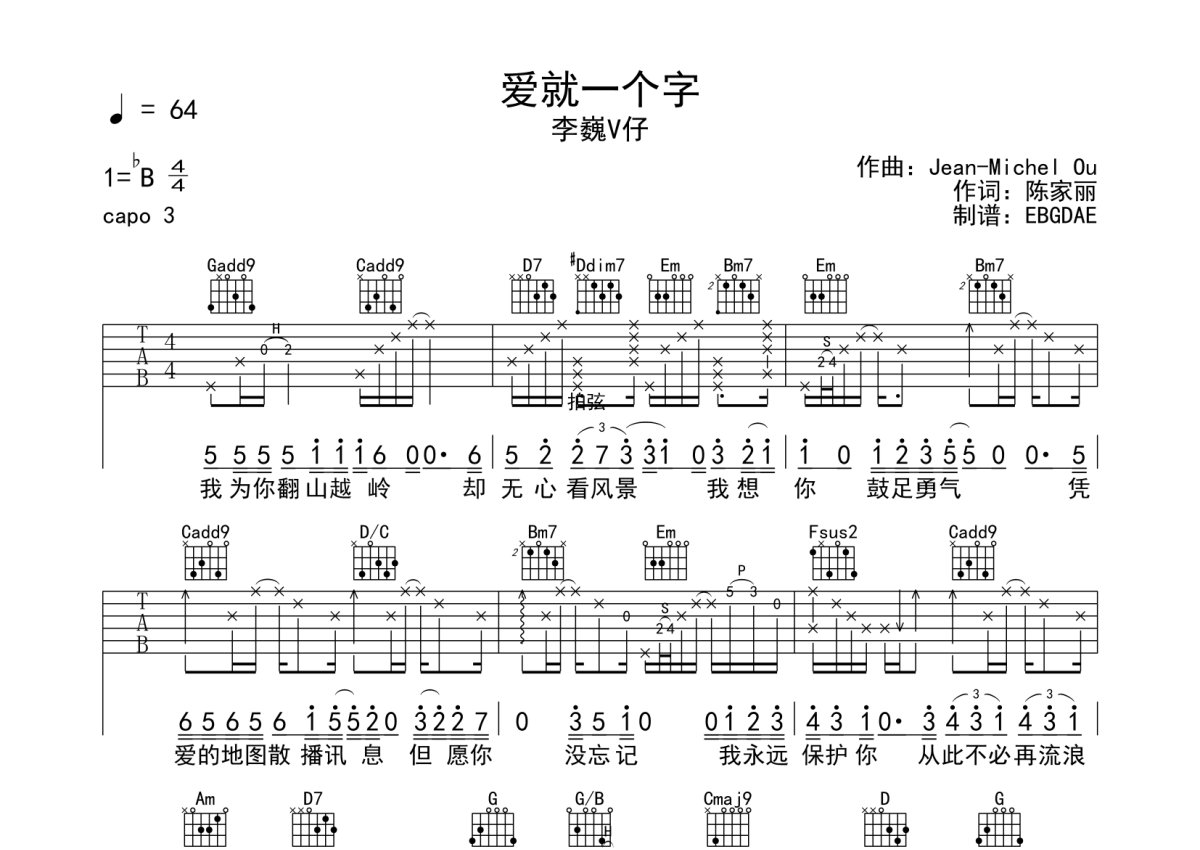 《爱就一个字》是李巍V仔演唱的一首歌曲,本吉他谱采用的是G调指法编配,这份吉他谱共有三张高清图谱,图谱由 @EBGDAE 编配上传,图谱使用六线谱编配,包含吉他和弦指法、简谱以及歌词部分,使用这份爱就一个字吉他谱,可以让你更加方便地掌握这首歌曲的弹唱技巧,快来尝试吧。原版编配,物美价廉,放心选购!加油!。