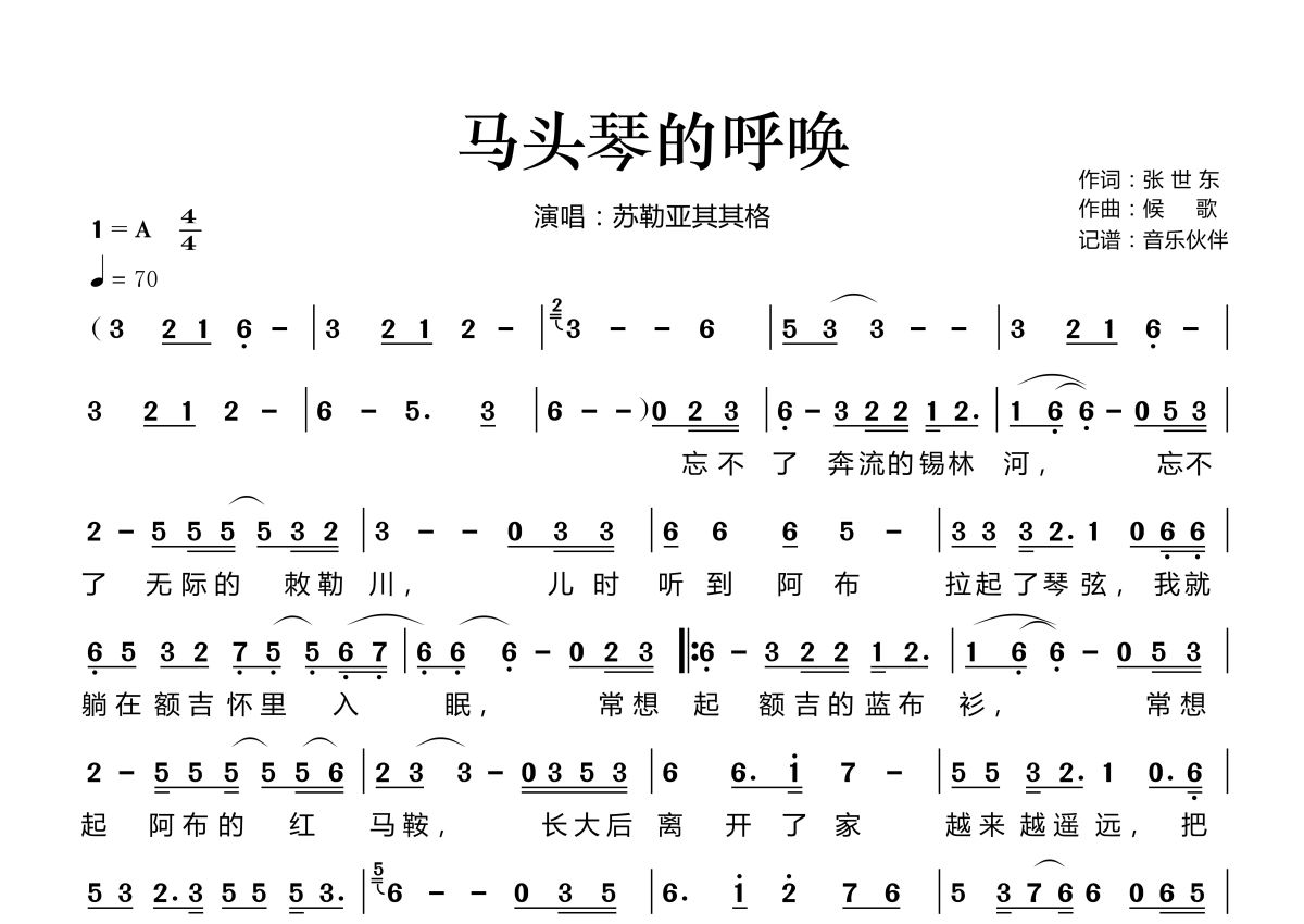 《马头琴的呼唤》是苏勒亚其其格演唱的一首歌曲,拍号为4/4拍,歌曲速度为每分钟70拍,这份简谱共有一张高清图谱,图谱由 @音乐伙伴 编配上传。