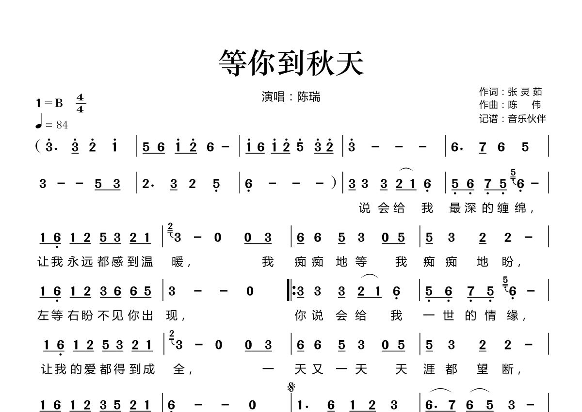 《等你到秋天》是陈瑞演唱的一首歌曲,拍号为4/4拍,歌曲速度为每分钟84拍,这份简谱共有一张高清图谱,图谱由 @音乐伙伴 编配上传。