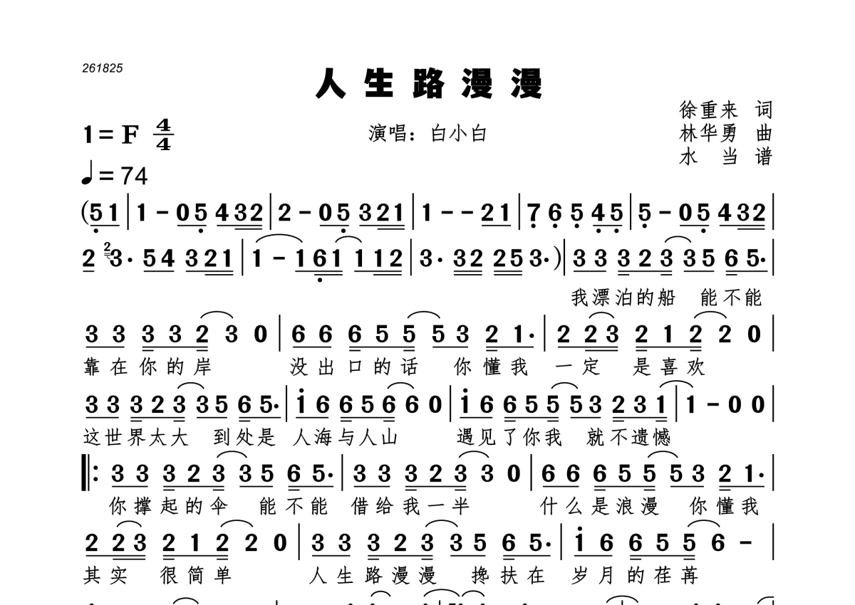 《人生路漫漫》是白小白演唱的一首歌曲,拍号为4/4拍,歌曲速度为每分钟74拍,这份简谱共有一张高清图谱,图谱由 @水当 编配上传。