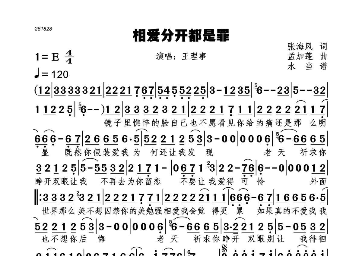 相爱分开都是罪简谱 - 王理事演唱
