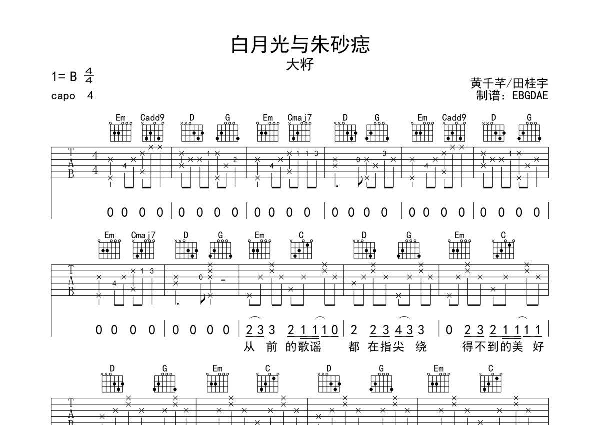 大籽《白月光与朱砂痣》吉他谱 - G调弹唱六线谱