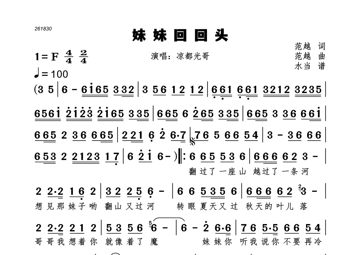 《妹妹回回头》是凉都光哥演唱的一首歌曲,拍号为4/4拍,歌曲速度为每分钟100拍,这份简谱共有一张高清图谱,图谱由 @水当 编配上传。