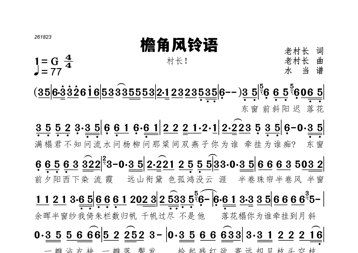 《檐角风铃语》是村长!演唱的一首歌曲,拍号为4/4拍,歌曲速度为每分钟77拍,这份简谱共有两张高清图谱,图谱由 @水当 编配上传。
