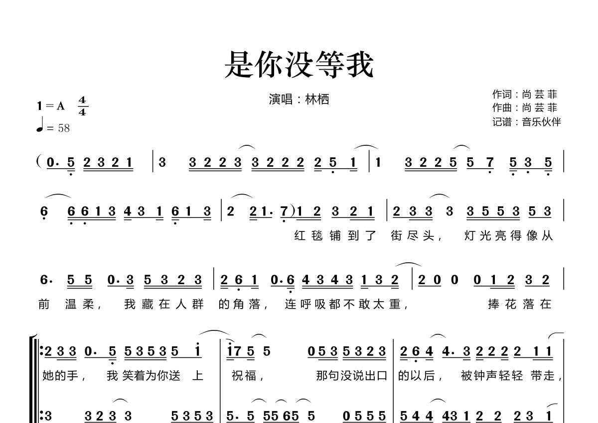 《是你没等我》是林栖演唱的一首歌曲,拍号为4/4拍,歌曲速度为每分钟58拍,这份简谱共有两张高清图谱,图谱由 @音乐伙伴 编配上传。