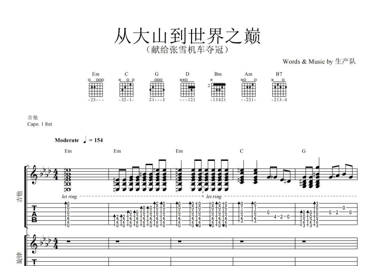 《从大山到世界之巅》是佚名演唱的一首歌曲,精编完美版,拍号为4/4拍,歌曲速度为每分钟154拍,歌曲原调为Ab调,但由于原调指法比较难,为了方便弹奏,本吉他谱采用的是G调指法编配,变调夹1品弹奏即为原调,当然也可以根据自己的音域改变变调夹位置,或者通过改变和弦调性,以方便自己弹奏,这份吉他谱共有十一张高清图谱,图谱由 @生产队 编配上传,图谱使用六线谱编配,包含吉他和弦指法、简谱以及歌词部分,曲谱配备了相关的音频提供试听,使用这份从大山到世界之巅吉他谱,可以让你更加方便地掌握这首歌曲的弹唱技巧,快来尝试吧。献给张雪机车夺冠歌曲《从大山到世界之巅》吉他弹唱谱,励志作品,满满的正能量,精编完美版,优质推荐!。