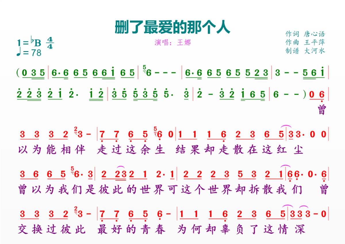 删了最爱的那个人简谱 - 王娜演唱