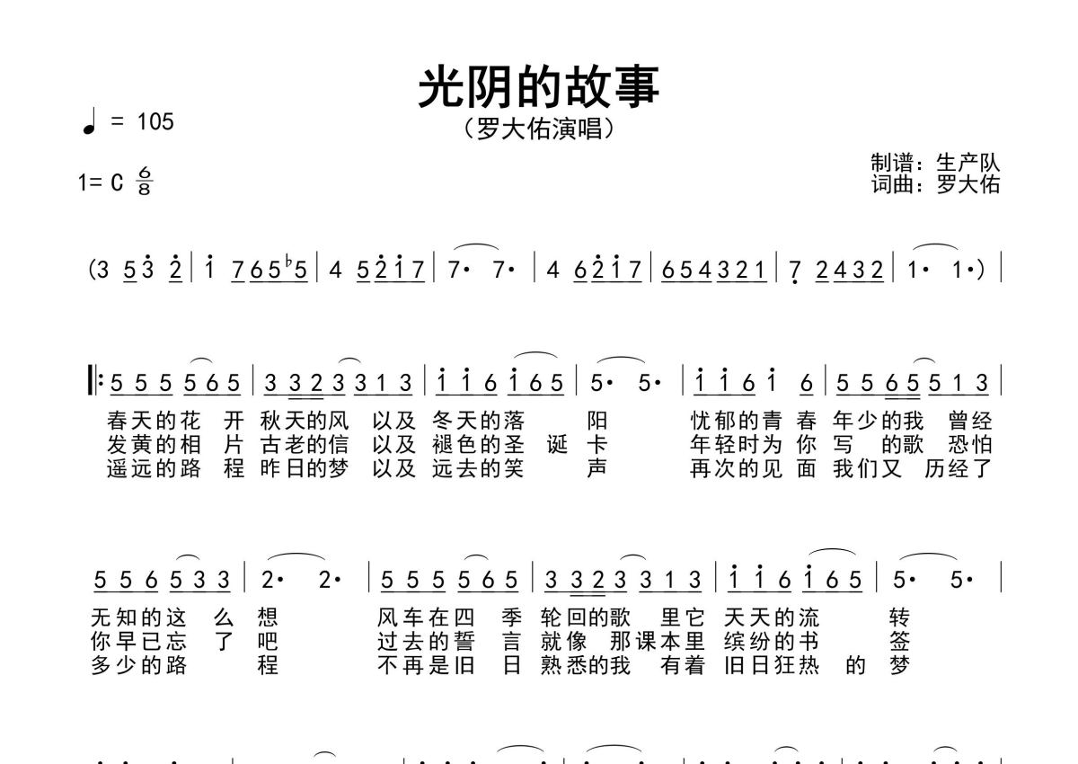 《光阴的故事》是罗大佑演唱的一首歌曲,原版简谱,拍号为6/8拍,歌曲速度为每分钟105拍,这份简谱共有一张高清图谱,图谱由 @生产队 编配上传罗大佑作词、作曲并演唱的歌曲《光阴的故事》原简谱,含精准的前奏、间奏、尾奏solo编配,精编完美版,优质推荐!。