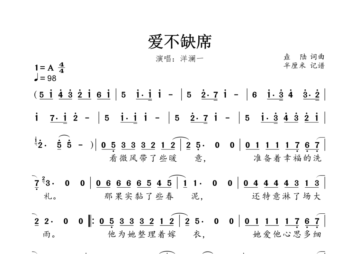 《爱不缺席》是洋澜一演唱的一首歌曲,拍号为4/4拍,这份简谱共有两张高清图谱,图谱由 @半厘米 编配上传。
