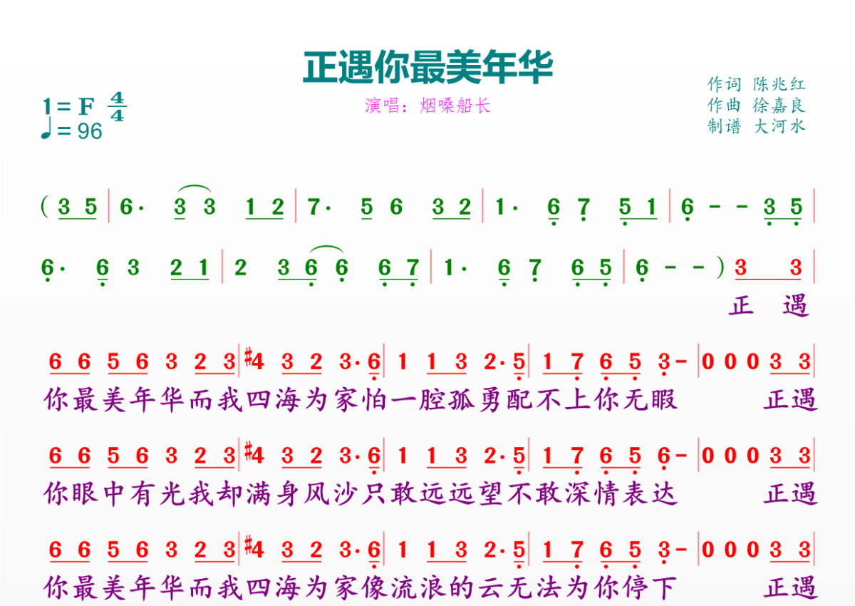 正遇你最美年华简谱 - 烟嗓船长演唱