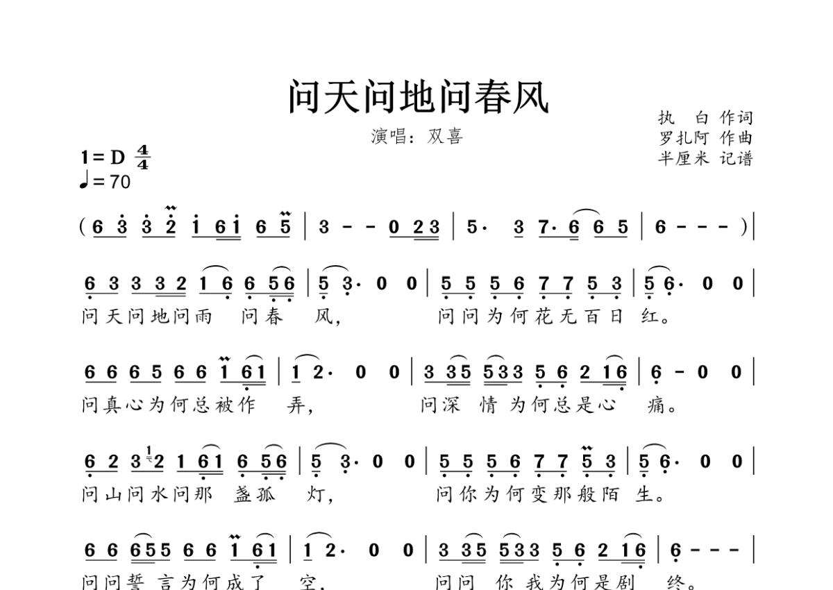 《问天问地问春风》是双喜演唱的一首歌曲,这份简谱共有一张高清图谱,图谱由 @半厘米 编配上传。