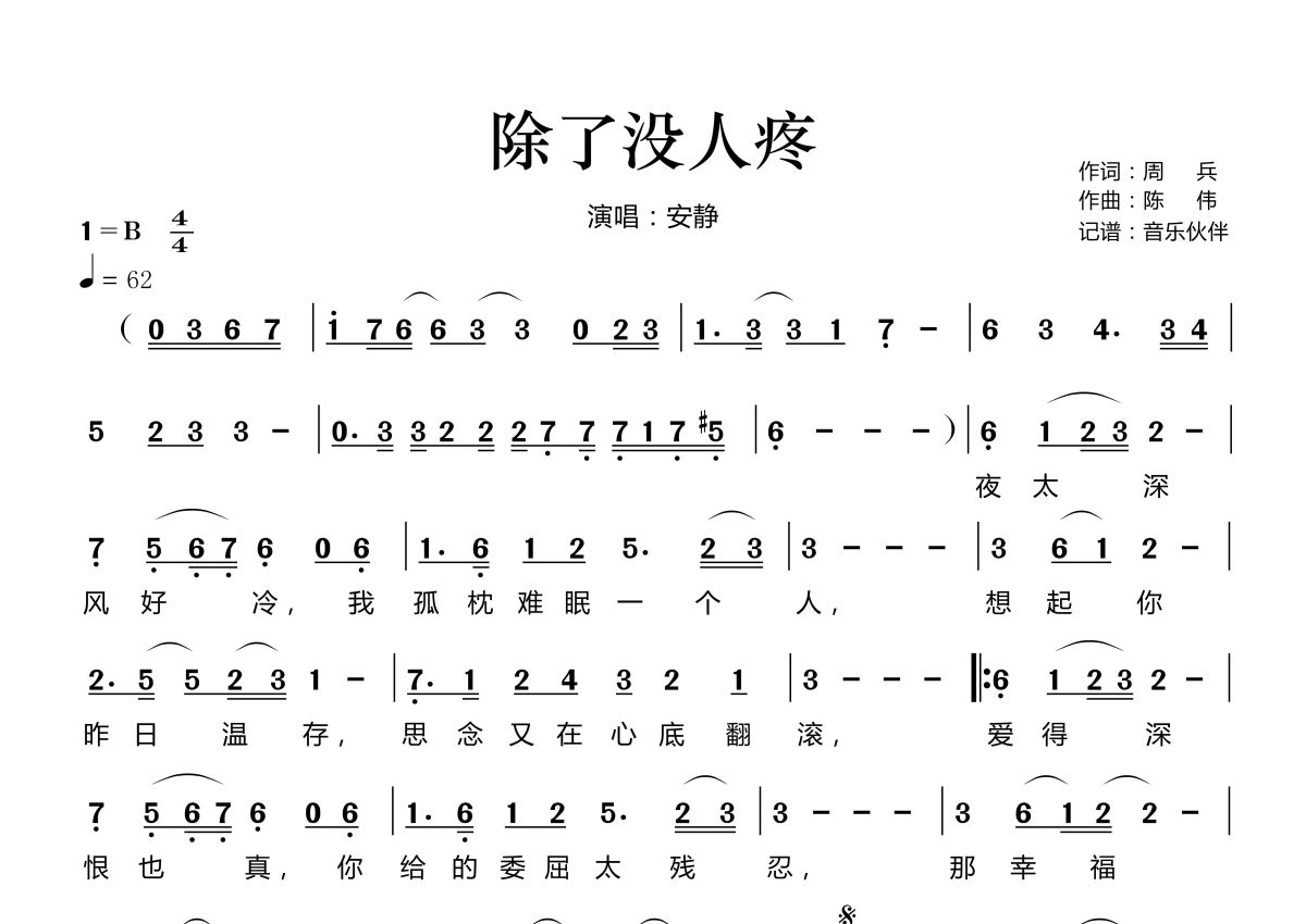 《除了没人疼》是安静演唱的一首歌曲,拍号为4/4拍,歌曲速度为每分钟62拍,这份简谱共有一张高清图谱,图谱由 @音乐伙伴 编配上传。