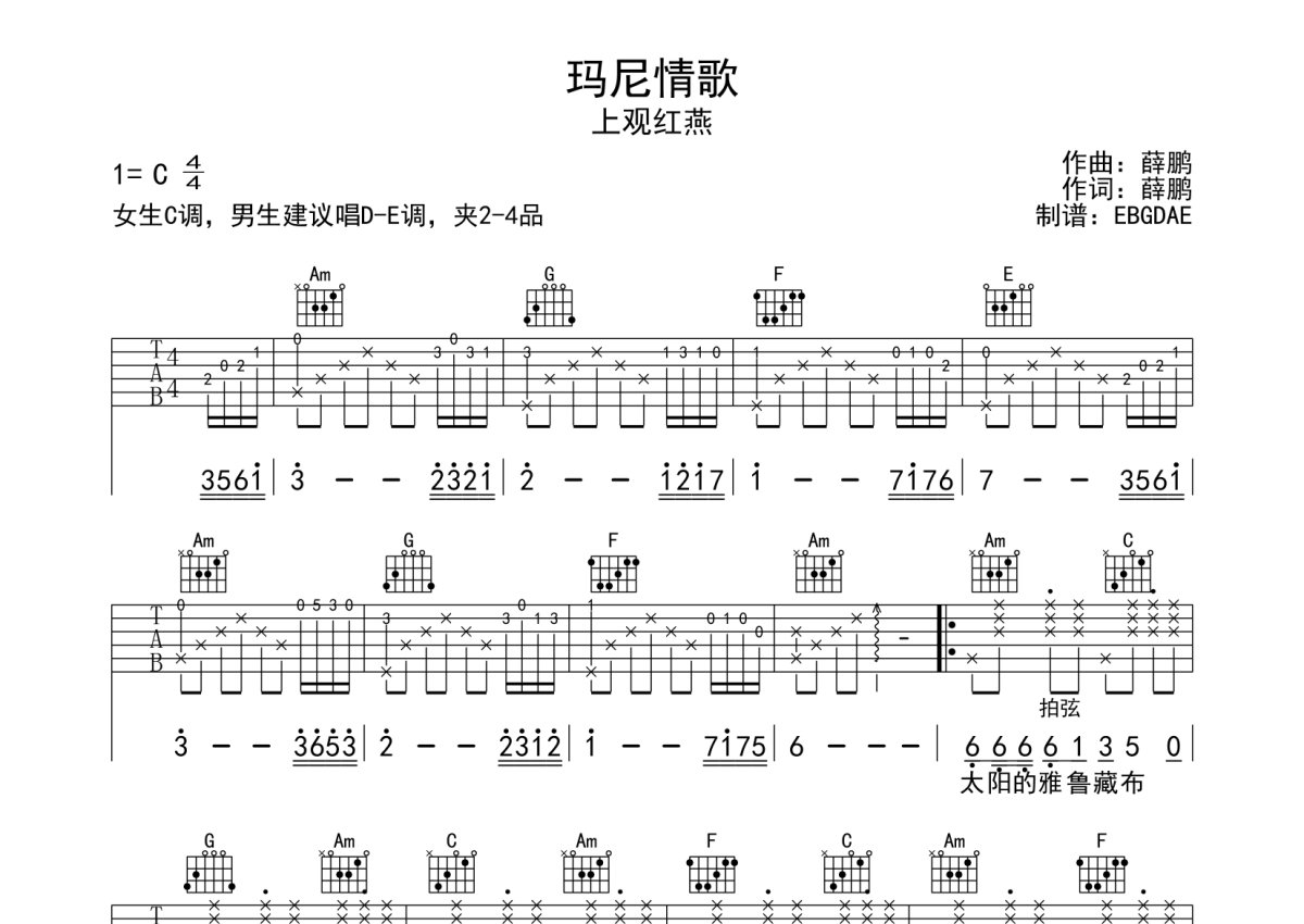 上观红燕《玛尼情歌》吉他谱 - C调弹唱六线谱