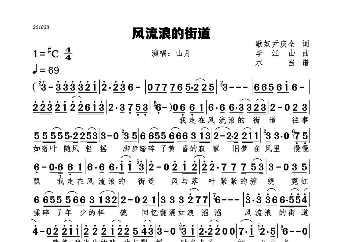 《风流浪的街道》是山月演唱的一首歌曲,拍号为4/4拍,歌曲速度为每分钟69拍,这份简谱共有一张高清图谱,图谱由 @水当 编配上传。