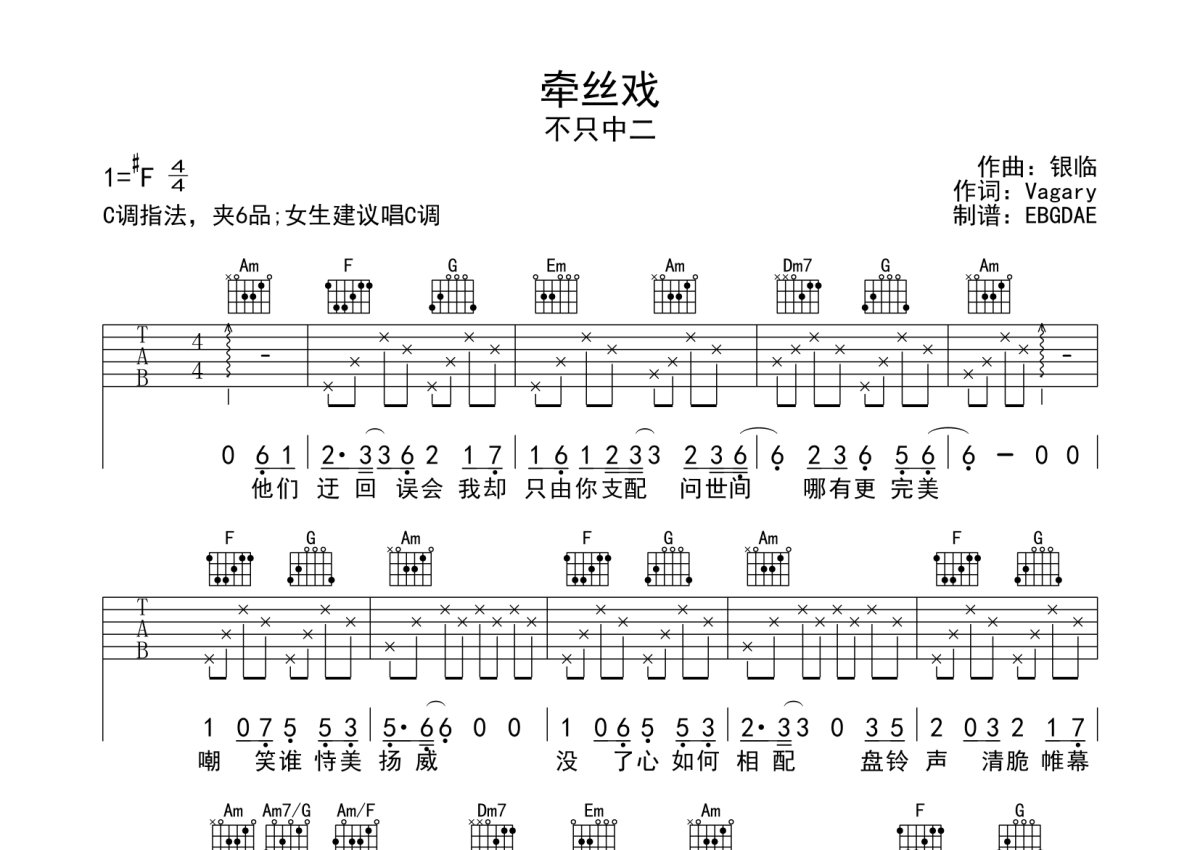 不只中二《牵丝戏》吉他谱 - C调弹唱六线谱