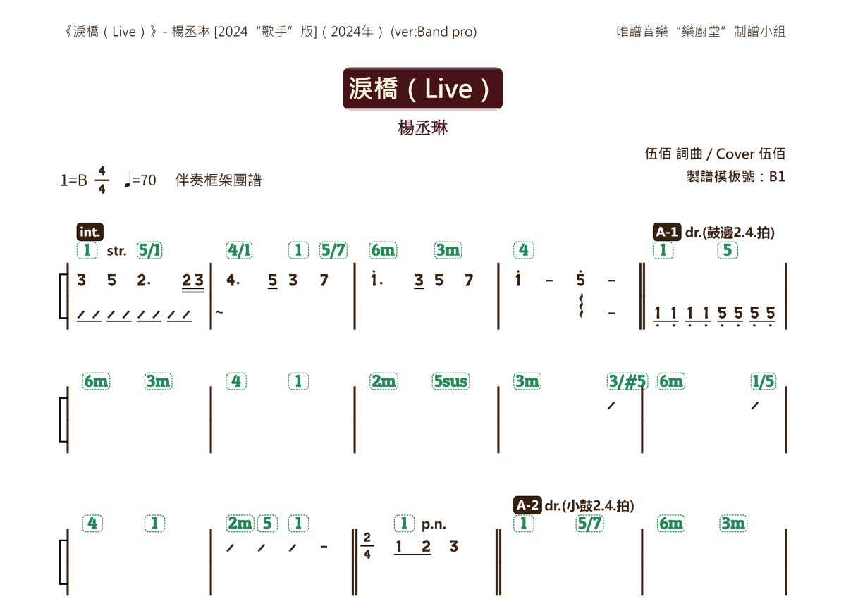 《泪桥(Live)》是Live演唱的一首歌曲,框架功能谱,这份乐队总谱共有两张高清图谱,图谱由 @唯谱音乐"乐厨堂"发布小组 编配上传。