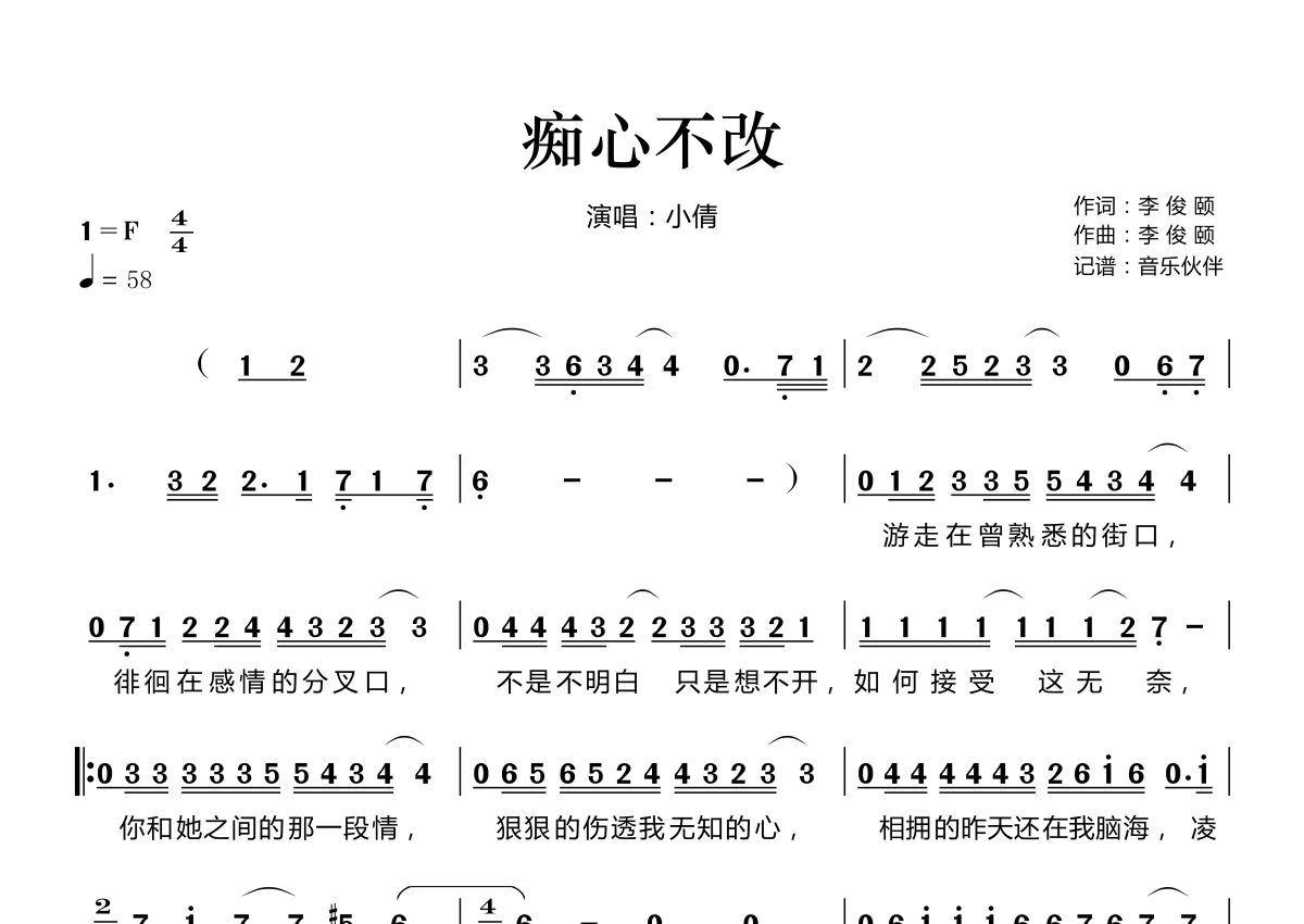 《痴心不改》是小倩演唱的一首歌曲,拍号为4/4拍,歌曲速度为每分钟58拍,这份简谱共有两张高清图谱,图谱由 @音乐伙伴 编配上传。