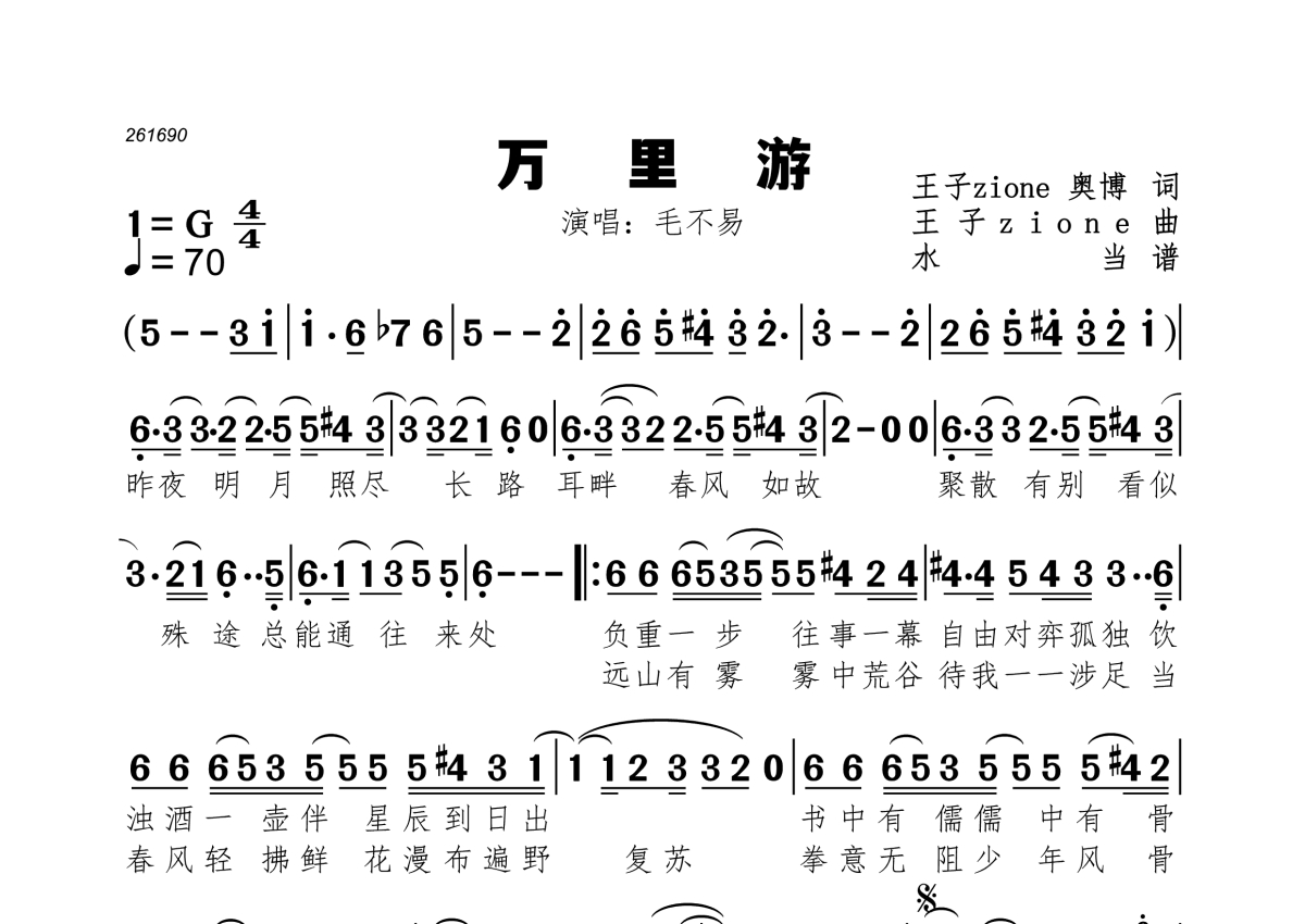 《万里游》是毛不易演唱的一首歌曲,拍号为4/4拍,歌曲速度为每分钟70拍,这份简谱共有一张高清图谱,图谱由 @水当 编配上传。