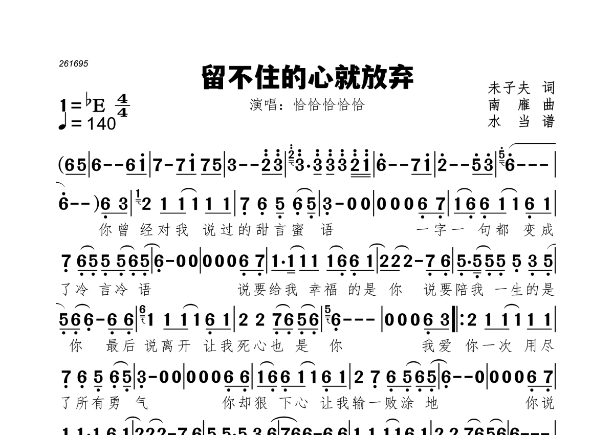 《留不住的心就放弃》是恰恰恰恰恰演唱的一首歌曲,拍号为4/4拍,歌曲速度为每分钟140拍,这份简谱共有一张高清图谱,图谱由 @水当 编配上传。