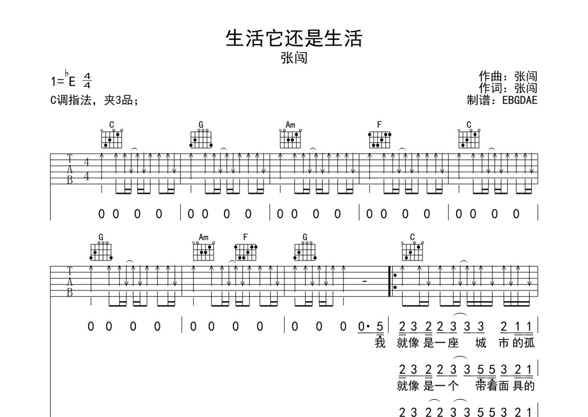 张闯《生活它还是生活》吉他谱 - C调弹唱六线谱