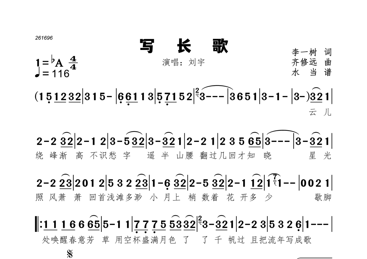 《写长歌》是刘宇演唱的一首歌曲,歌曲速度为每分钟116拍,这份简谱共有一张高清图谱,图谱由 @水当 编配上传。