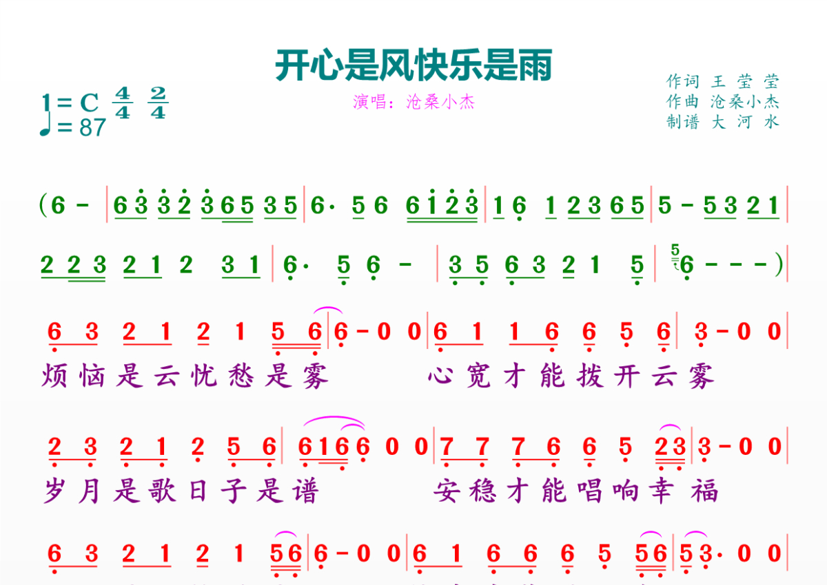 《开心是风愉快是雨》是沧桑小杰演唱的一首歌曲,拍号为4/4拍,歌曲速度为每分钟87拍,这份简谱共有一张高清图谱,图谱由 @临海雪原 编配上传。