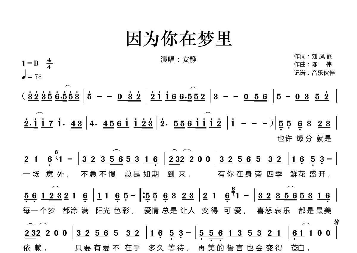《因为你在梦里》是安静演唱的一首歌曲,拍号为4/4拍,歌曲速度为每分钟78拍,这份简谱共有一张高清图谱,图谱由 @音乐伙伴 编配上传。