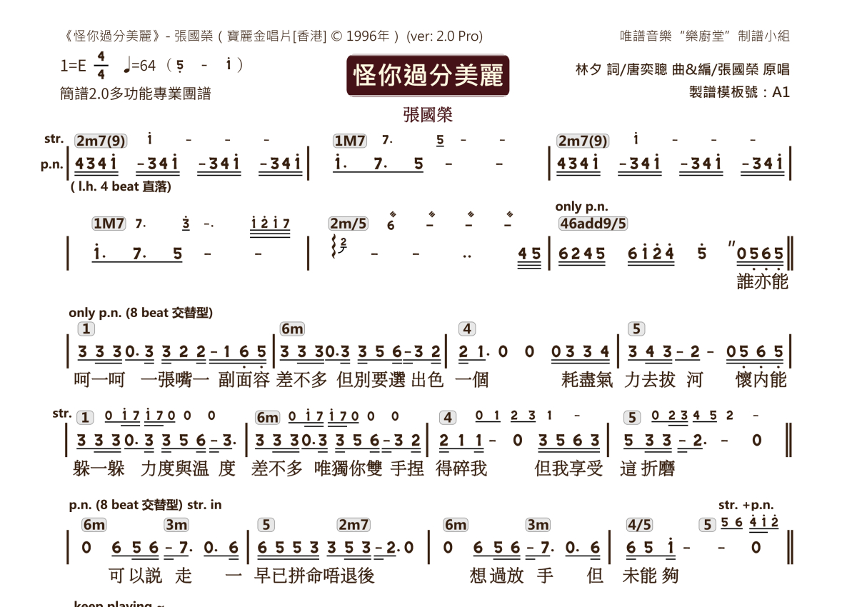 《怪你过分美丽》是张国荣演唱的一首歌曲,2.0版多功能团谱,这份乐队总谱共有两张高清图谱,图谱由 @唯谱音乐"乐厨堂"发布小组 编配上传。