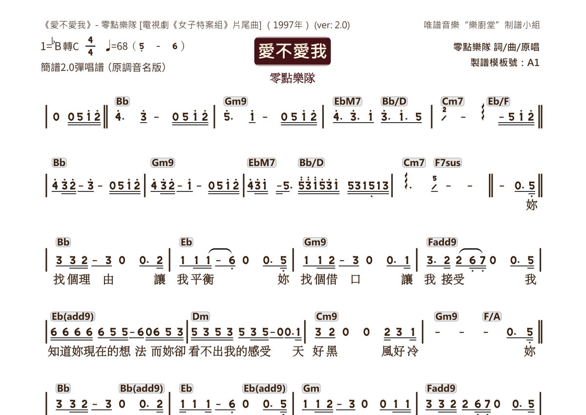 零点乐队《爱不爱我》简谱 - 简谱2.0弹唱谱音名版
