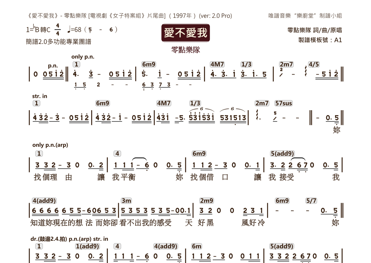 “乐厨堂”乐谱发布小组: 出版级乐谱扒谱制谱——以职业乐手圈通行标准记谱,遵循原版和声、伴奏元素和段落结构。 ❶ 2.0多功能专业团谱:采用台湾卓著公司开创的二代简谱标准制作。二代简谱无疑是迄今为止最科学、最易读的专业范畴多功能记谱方案:❷ 框架谱:采用职业乐手通常记谱方案制作。