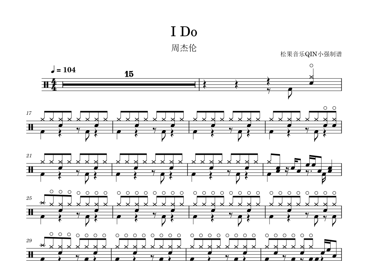 《I Do》是周杰伦演唱的一首歌曲,拍号为4/4拍,这份架子鼓谱共有两张高清图谱,图谱由 @松果音乐QIN小强 编配上传,图谱使用五线谱编配,使用这份I Do架子鼓谱,你将能够轻松地敲打出这首周杰伦的I Do,快来尝试吧。《I Do》是周杰伦演唱的歌曲,由方文山作词,周杰伦作曲,周杰伦、派伟俊、吕尚霖编曲 。该曲收录于周杰伦的第16张录音室专辑《太阳之子》,于2026年3月25日随专辑通过杰威尔音乐有限公司发行。