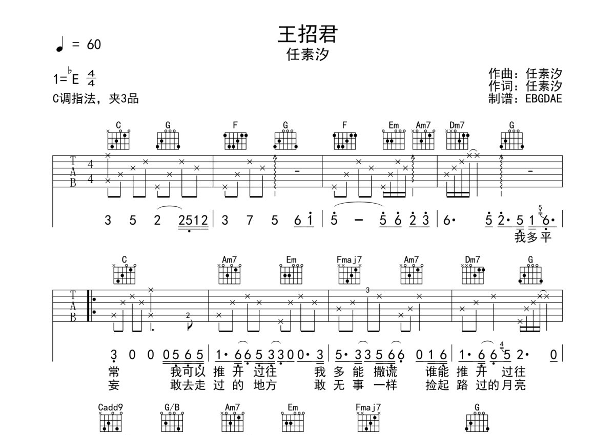 任素汐《王招君》吉他谱 - C调弹唱六线谱