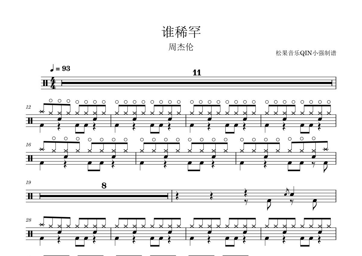《谁稀罕》是周杰伦演唱的一首歌曲,拍号为4/4拍,这份架子鼓谱共有两张高清图谱,图谱由 @松果音乐QIN小强 编配上传,图谱使用五线谱编配,使用这份谁稀罕架子鼓谱,你将能够轻松地敲打出这首周杰伦的谁稀罕,快来尝试吧。《谁稀罕》是周杰伦演唱的歌曲,由周杰伦作词、作曲,派伟俊、吕尚霖编曲 。该曲收录于周杰伦暌违近四年的第16张录音室专辑《太阳之子》,于2026年3月25日随专辑通过杰威尔音乐有限公司发行。