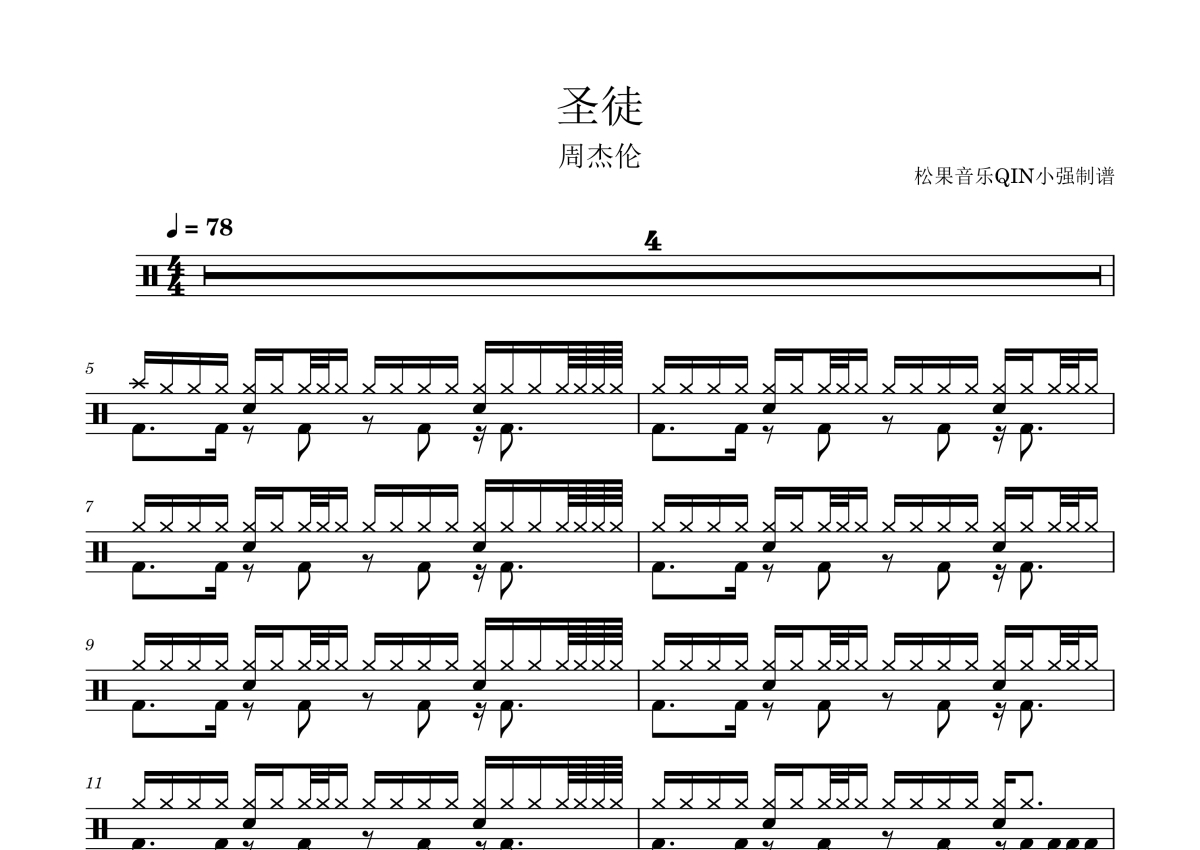 《圣徒》是周杰伦演唱的一首歌曲,拍号为4/4拍,这份架子鼓谱共有三张高清图谱,图谱由 @松果音乐QIN小强 编配上传,图谱使用五线谱编配,使用这份圣徒架子鼓谱,你将能够轻松地敲打出这首周杰伦的圣徒,快来尝试吧。《圣徒》是周杰伦演唱的歌曲,由黄俊郎作词,周杰伦作曲,派伟俊编曲。该曲收录于周杰伦的第16张录音室专辑《太阳之子》,于2026年3月25日随专辑通过杰威尔音乐有限公司发行。