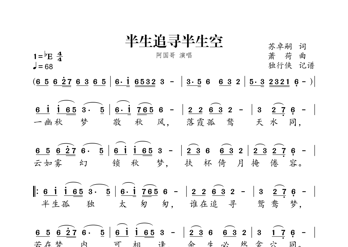 《半生追寻半生空》是阿国哥演唱的一首歌曲,拍号为4/4拍,歌曲速度为每分钟68拍,这份简谱共有一张高清图谱,图谱由 @独行侠 编配上传。