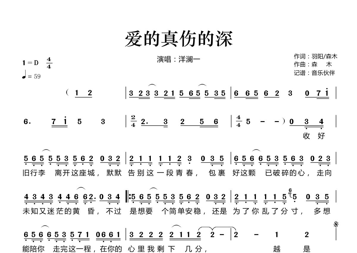 《爱的真伤的深》是洋澜一演唱的一首歌曲,拍号为4/4拍,歌曲速度为每分钟59拍,这份简谱共有一张高清图谱,图谱由 @音乐伙伴 编配上传。