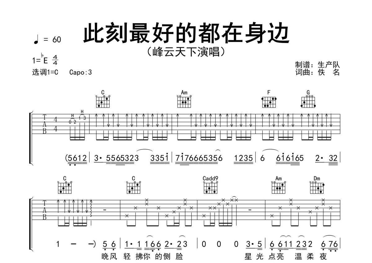 《此刻最好的都在身边》是峰云天下演唱的一首歌曲,精编完美版,拍号为4/4拍,歌曲速度为每分钟60拍,歌曲原调为Eb调,但由于原调指法比较难,为了方便弹奏,本吉他谱采用的是C调指法编配,变调夹3品弹奏即为原调,当然也可以根据自己的音域改变变调夹位置,或者通过改变和弦调性,以方便自己弹奏,这份吉他谱共有三张高清图谱,图谱由 @生产队 编配上传,图谱使用六线谱编配,包含吉他和弦指法、简谱以及歌词部分,使用这份此刻最好的都在身边吉他谱,可以让你更加方便地掌握这首歌曲的弹唱技巧,快来尝试吧。峰云天下演唱的歌曲《此刻最好的都在身边》原版吉他谱,含精准的前奏、间奏、尾奏solo编配,精编完美版,优质推荐!。