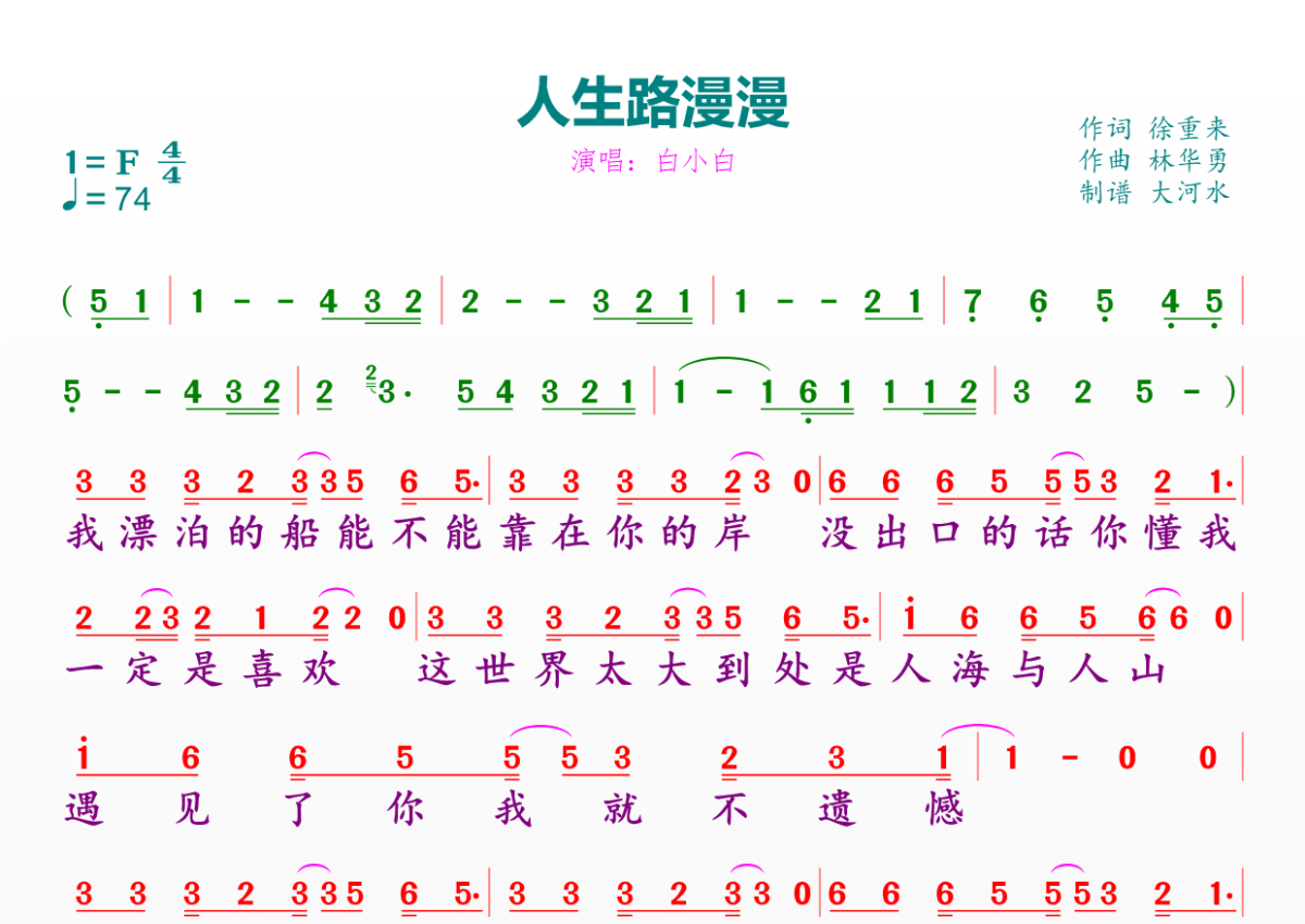 《人生路漫漫》是白小白演唱的一首歌曲,拍号为4/4拍,歌曲速度为每分钟74拍,这份简谱共有一张高清图谱,图谱由 @临海雪原 编配上传。