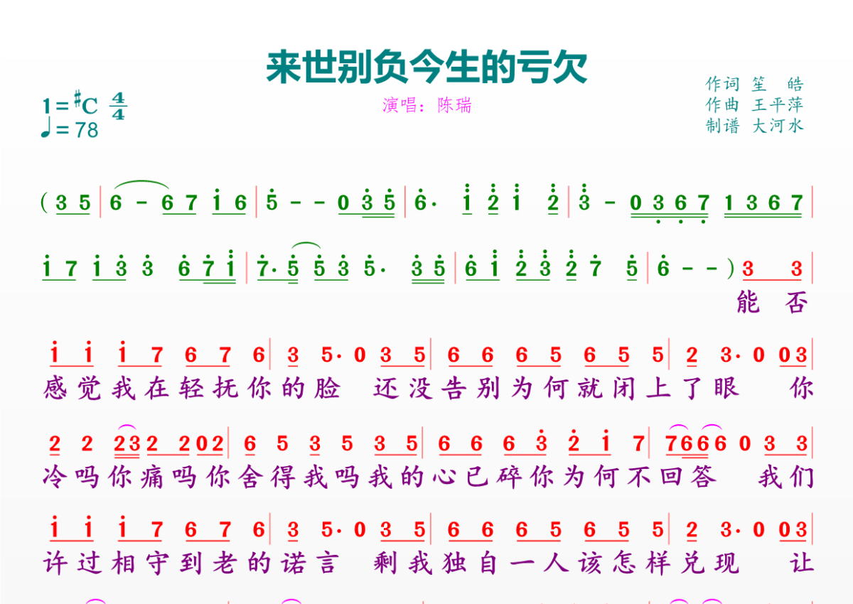 《来世别负今生的亏欠》是陈瑞演唱的一首歌曲,拍号为4/4拍,歌曲速度为每分钟78拍,这份简谱共有一张高清图谱,图谱由 @临海雪原 编配上传。
