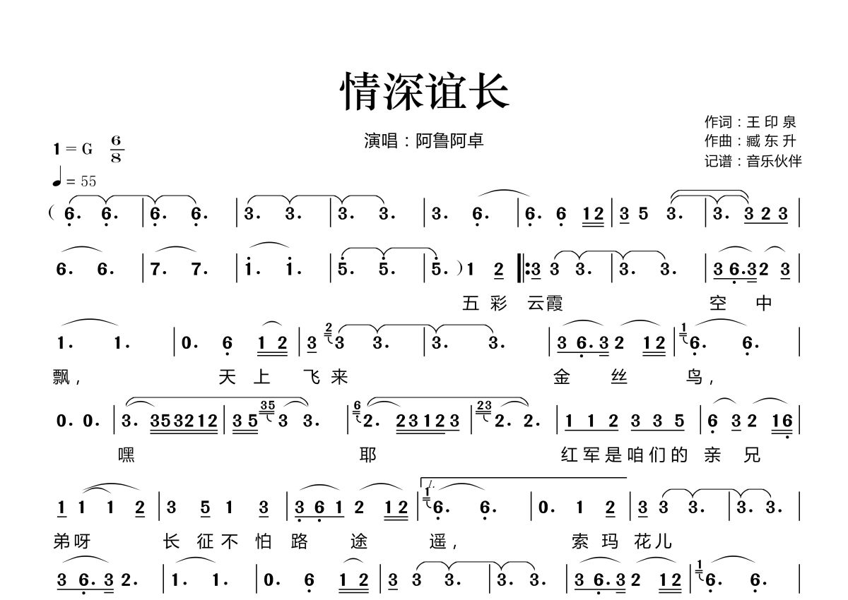 《情深谊长》是阿鲁阿卓演唱的一首歌曲,拍号为6/8拍,歌曲速度为每分钟55拍,这份简谱共有一张高清图谱,图谱由 @音乐伙伴 编配上传。