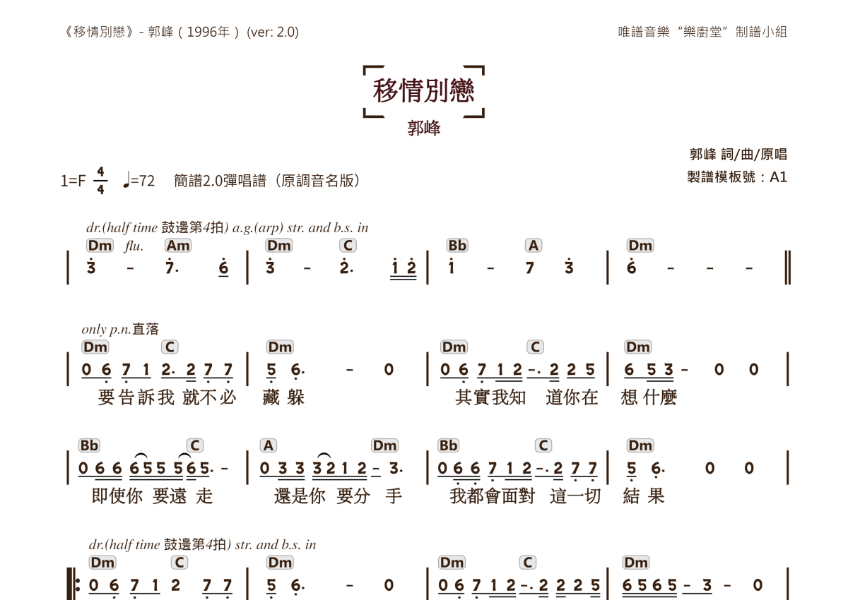 郭峰《移情别恋》简谱 - 简谱2.0弹唱谱音名版