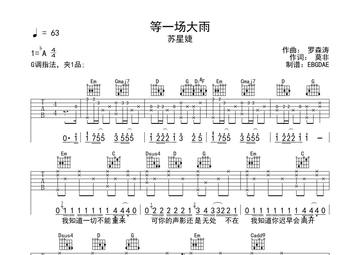 《等一场大雨》是苏星婕演唱的一首歌曲,本吉他谱采用的是G调指法编配,这份吉他谱共有两张高清图谱,图谱由 @EBGDAE 编配上传,图谱使用六线谱编配,包含吉他和弦指法、简谱以及歌词部分,使用这份等一场大雨吉他谱,可以让你更加方便地掌握这首歌曲的弹唱技巧,快来尝试吧。2张谱,免翻页排版设计。物美价廉,放心选购!加油!。