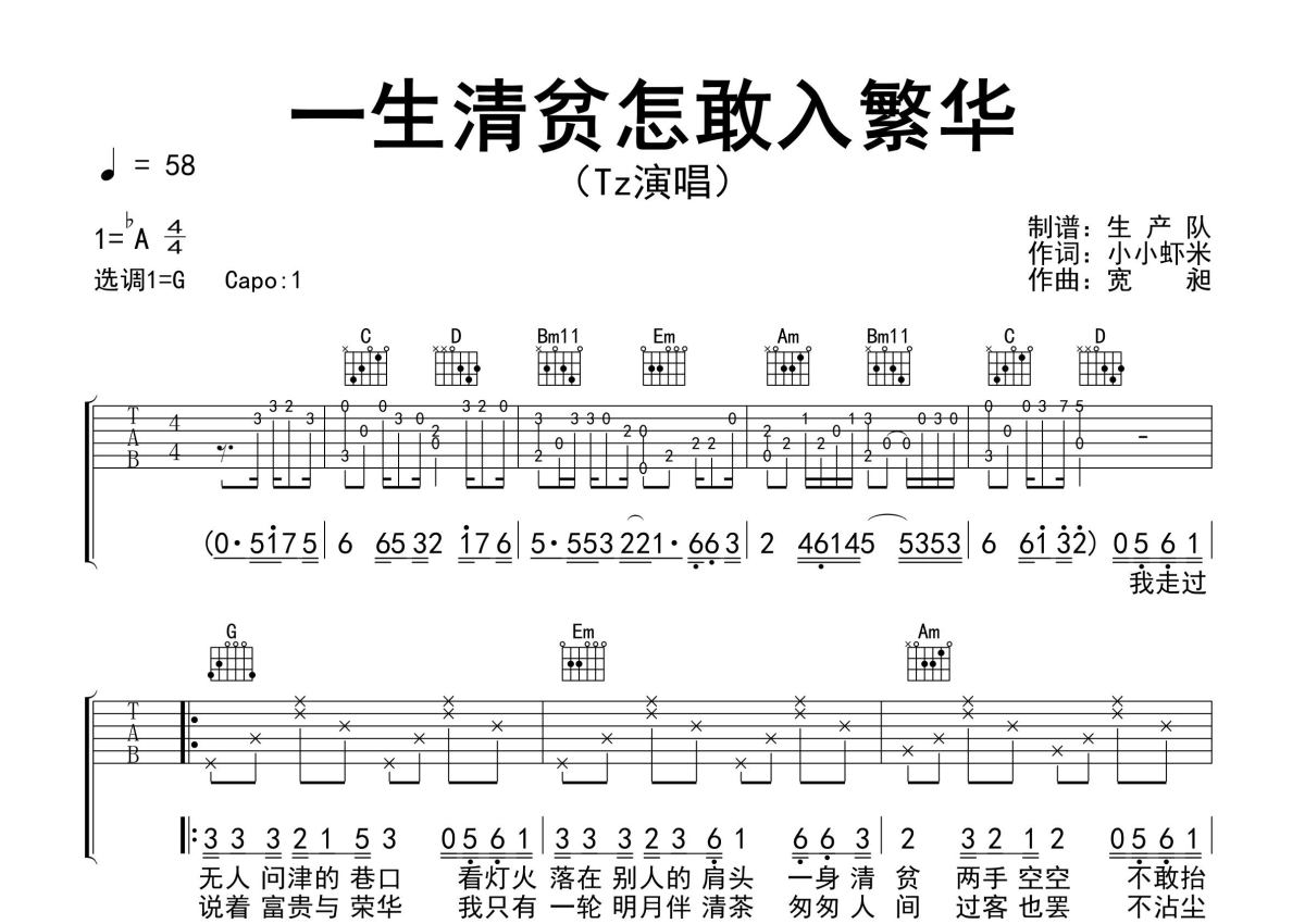 《一生清贫怎敢如繁华》是Tz演唱的一首歌曲,精编完美版,拍号为4/4拍,歌曲速度为每分钟58拍,歌曲原调为Ab调,但由于原调指法比较难,为了方便弹奏,本吉他谱采用的是G调指法编配,变调夹1品弹奏即为原调,当然也可以根据自己的音域改变变调夹位置,或者通过改变和弦调性,以方便自己弹奏,这份吉他谱共有两张高清图谱,图谱由 @生产队 编配上传,图谱使用六线谱编配,包含吉他和弦指法、简谱以及歌词部分,使用这份一生清贫怎敢如繁华吉他谱,可以让你更加方便地掌握这首歌曲的弹唱技巧,快来尝试吧。Tz演唱的歌曲《一生清贫怎敢如繁华》原版简谱,含精准的前奏、间奏、尾奏solo编配,精编完美版,优质推荐!。