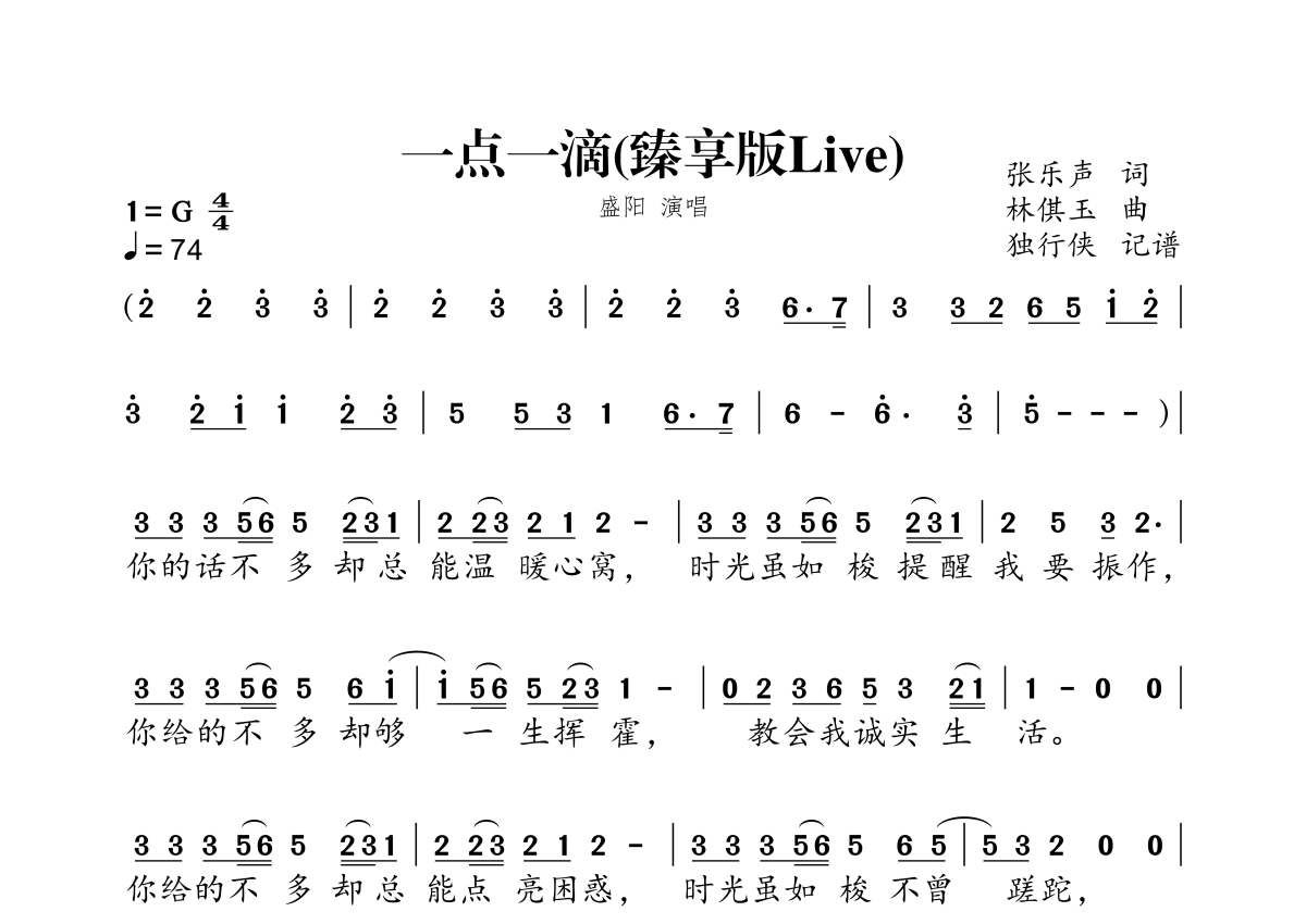 《一点一滴》是盛阳演唱的一首歌曲,拍号为4/4拍,歌曲速度为每分钟74拍,这份简谱共有两张高清图谱,图谱由 @独行侠 编配上传。