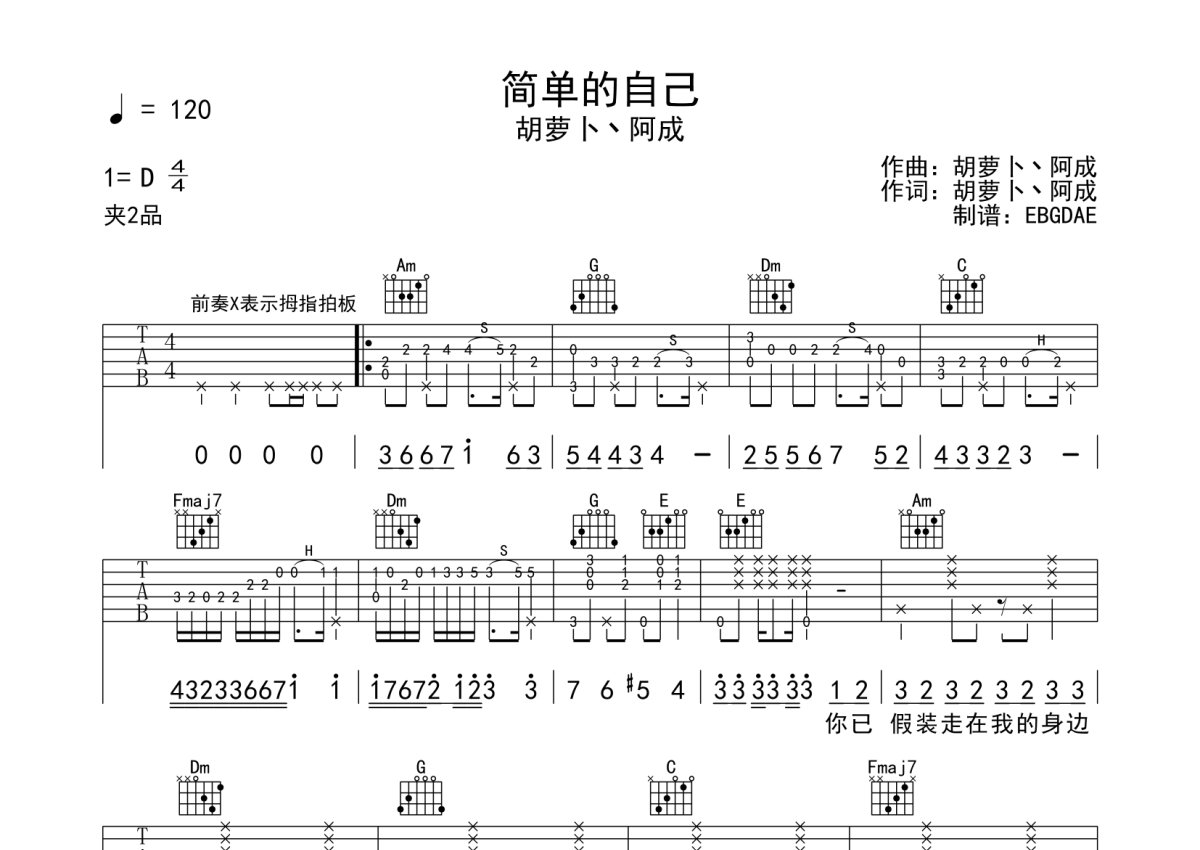 胡萝卜丶阿成《简单的自己》吉他谱 - C调弹唱六线谱