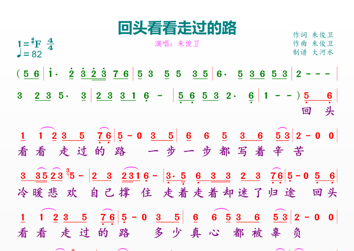 《回头看看走过的路》是朱俊卫演唱的一首歌曲,拍号为4/4拍,歌曲速度为每分钟82拍,这份简谱共有一张高清图谱,图谱由 @临海雪原 编配上传。
