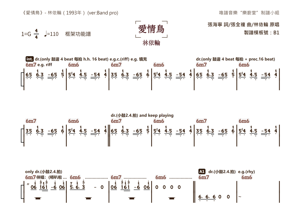“乐厨堂”乐谱发布小组: 出版级乐谱扒谱制谱——以职业乐手圈通行标准记谱,遵循原版和声、伴奏元素和段落结构。 ❶ 2.0多功能专业团谱:采用台湾卓著公司开创的二代简谱标准制作。二代简谱无疑是迄今为止最科学、最易读的专业范畴多功能记谱方案:❷ 框架谱:采用职业乐手通常记谱方案制作。