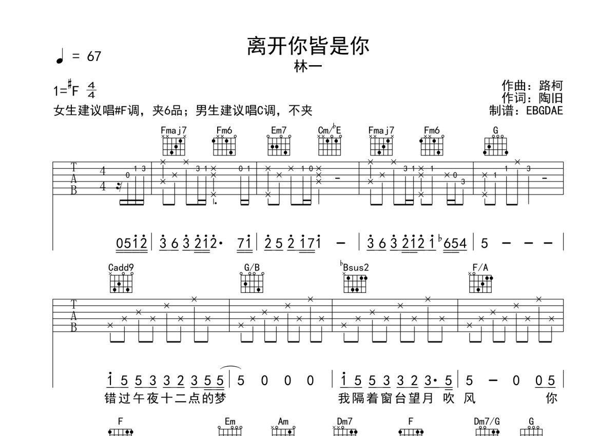 《离开你皆是你》是林一演唱的一首歌曲,本吉他谱采用的是C调指法编配,这份吉他谱共有三张高清图谱,图谱由 @EBGDAE 编配上传,图谱使用六线谱编配,包含吉他和弦指法、简谱以及歌词部分,使用这份离开你皆是你吉他谱,可以让你更加方便地掌握这首歌曲的弹唱技巧,快来尝试吧。原版编配,物美价廉,放心选购!加油!。