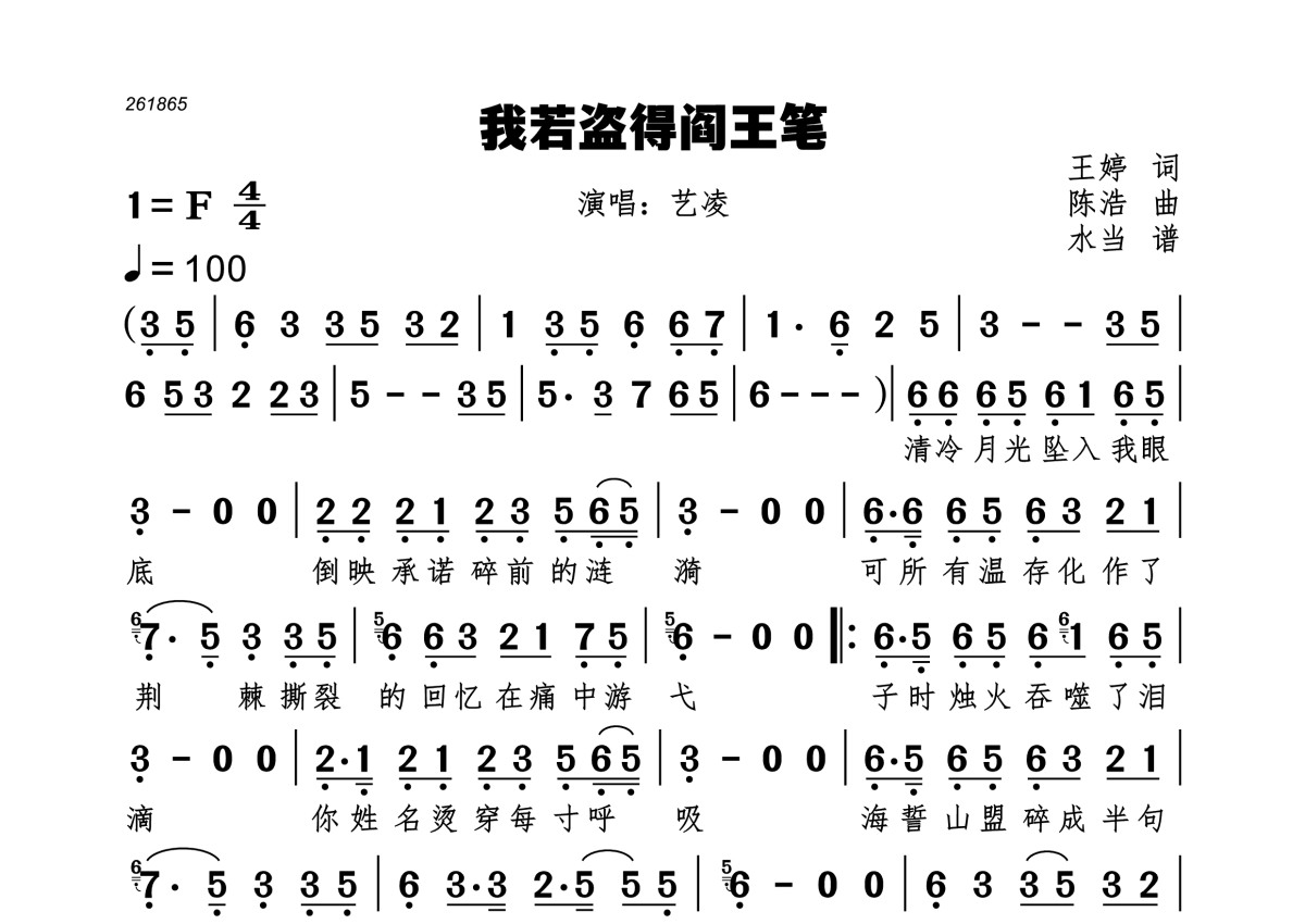 《我若盗得阎王笔》是艺凌演唱的一首歌曲,拍号为4/4拍,歌曲速度为每分钟100拍,这份简谱共有一张高清图谱,图谱由 @水当 编配上传。
